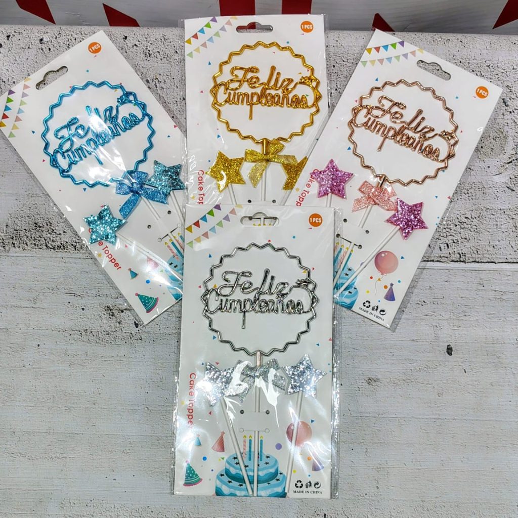 / CAKE TOPPER FELIZ CUMPLEAÑOS 3D CURSIVA METALIZADO CIRCULO ONDAS 3 PIEZAS IMP 45081