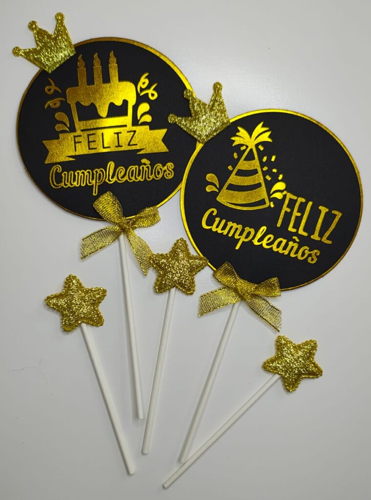 / Cake Topper Feliz Cumpleaños Circular Negro C/ Dorado Modelos Surtidos IMP. 52291