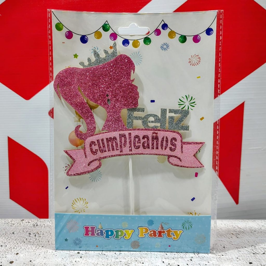 / CAKE TOPPER FELIZ CUMPLEAÑOS SILUETA BARBIE GIBREADA ROSA Y PLATA IMP. 45080