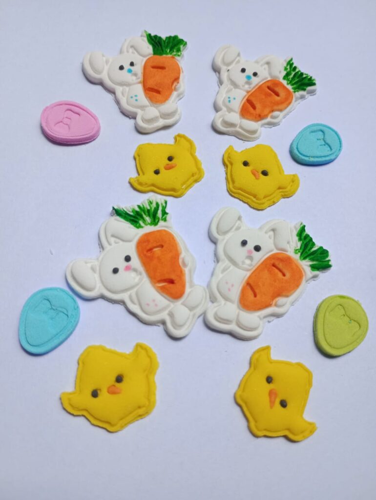 Kit Pascuas 3 pastillaje (4 conejos c/zanahoria + 4 pollitos + 4 huevitos)