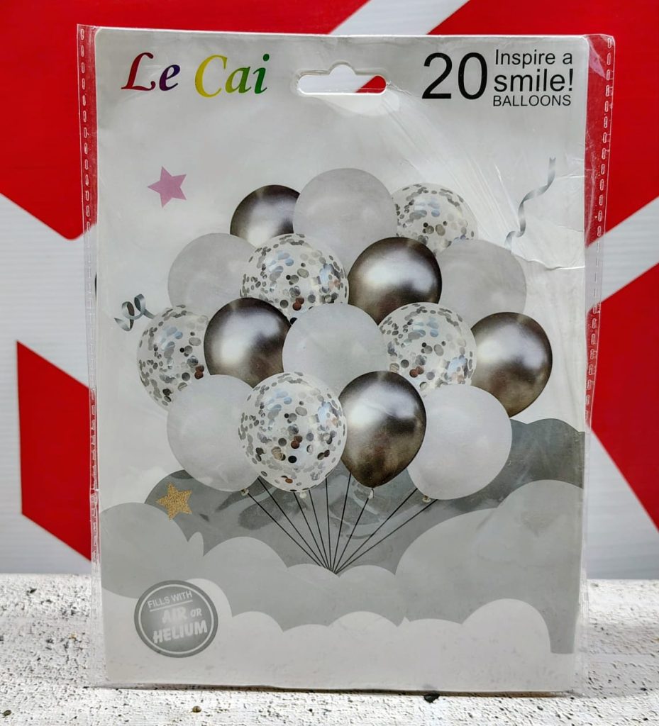 SET 20 GLOBOS LATEX CONFETTI TRICOLOR PLATA/BLANCO IMP 46438