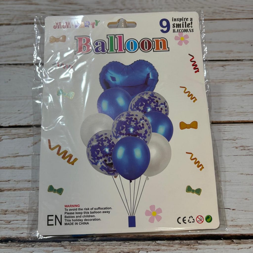 SET 9 GLOBOS CORAZON METALIZADO LATEX CONFETTI AZUL IMP. 38346