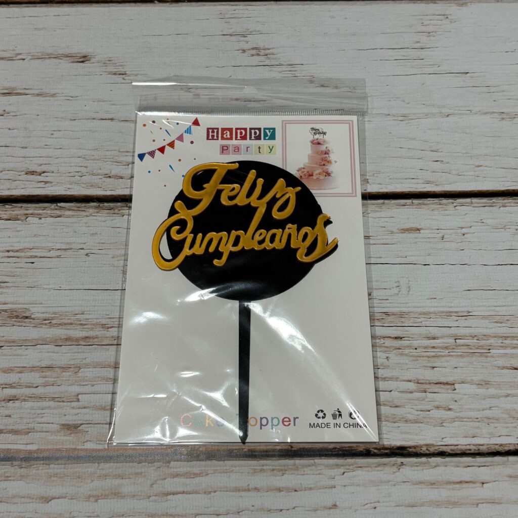 / Topper Acrilico Feliz Cumple Dorado y Negro Redondo IMP. 38352