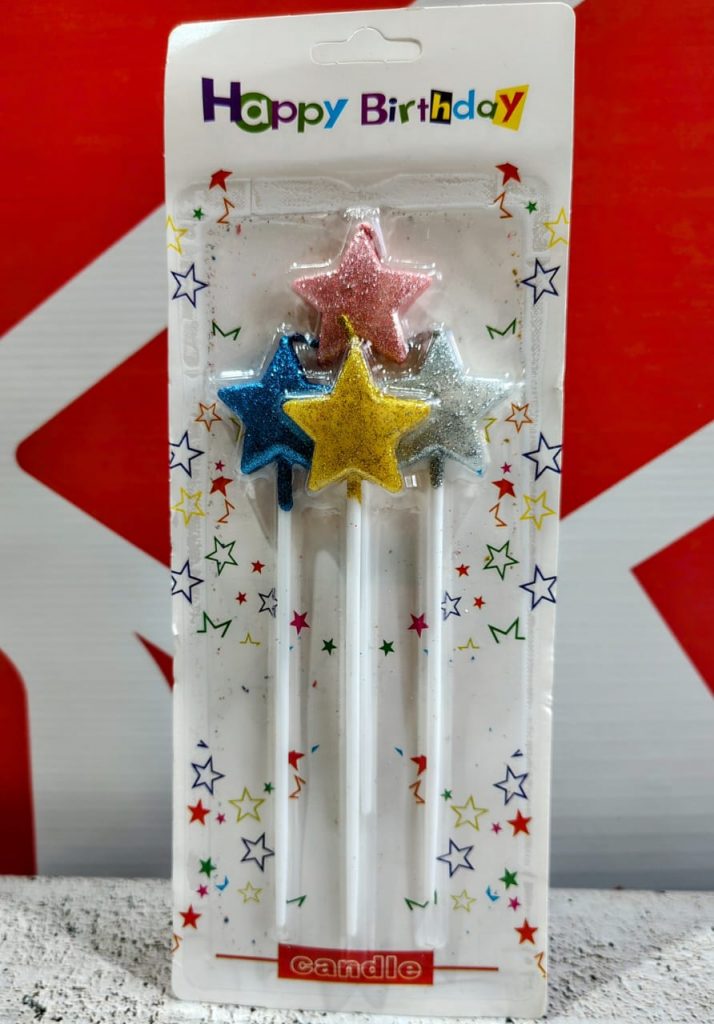 Velas Estrellas Gibreadas Multicolor con Palito x 4 Unid. IMP. 37093